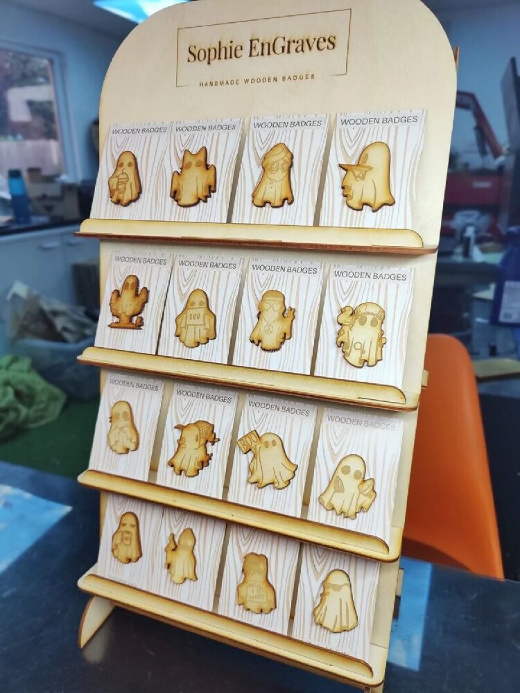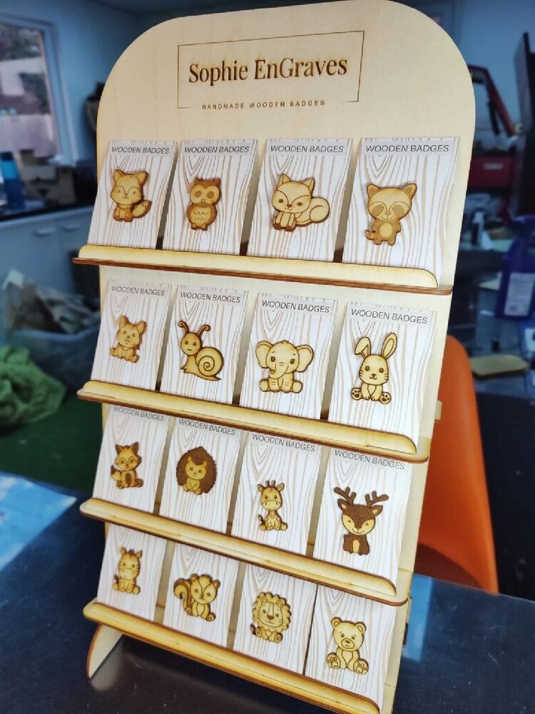 She mostly creates wooden badges in a large range of designs (more than what you see here on her Etsy store).